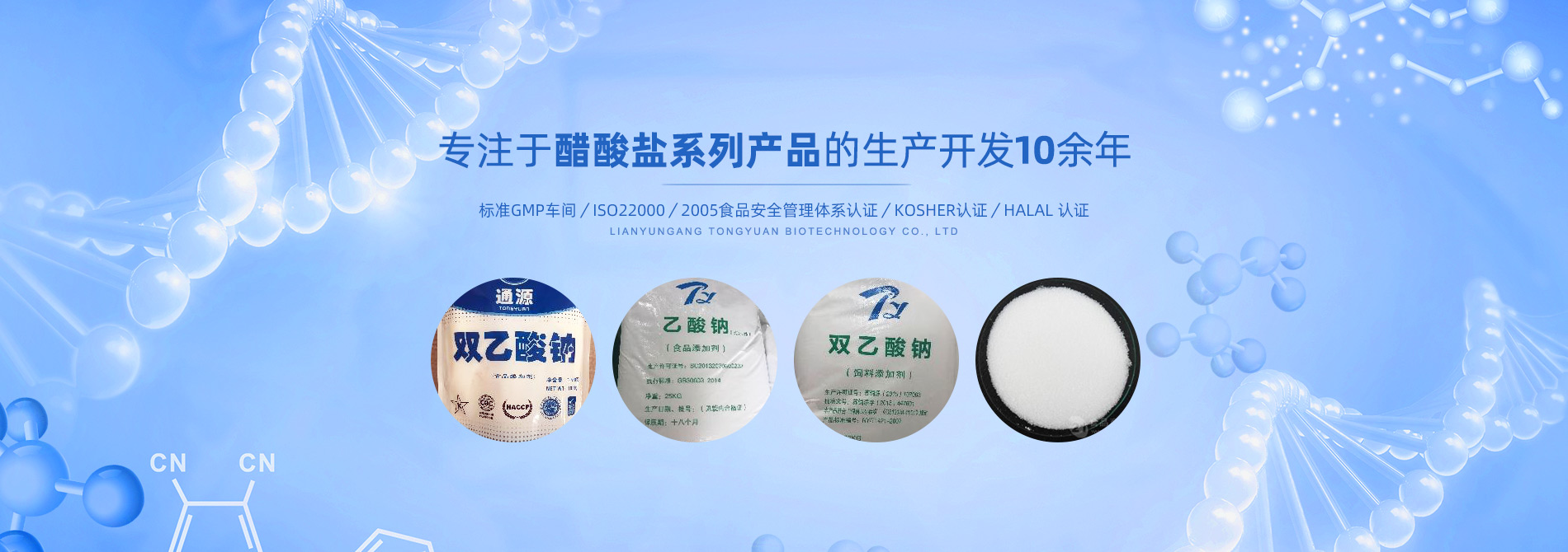 連云港市通源生物科技有限公司 是生產(chǎn)雙乙酸鈉、無水醋酸鈉、三水醋酸鈉、醋酸鉀、乙酸鈉、丙酸鈉、丙酸鈣和氯化鉀等系類醋酸鹽產(chǎn)品的專業(yè)制造商。公司專注于醋酸鹽系列產(chǎn)品的生產(chǎn)開發(fā)10余年,是國(guó)內(nèi)專業(yè)醋酸酸鹽產(chǎn)品生產(chǎn)基地。 目前,我們已和全球30多個(gè)國(guó)家和地區(qū)建立長(zhǎng)期的業(yè)務(wù)合作關(guān)系,是中國(guó)較大的雙乙酸鈉生產(chǎn)商和出口商之一。作為中國(guó)食品添加劑和配料協(xié)會(huì)理事單位,通源公司已建成標(biāo)準(zhǔn)GMP車間5000余平方米,通過了ISO22000:2005食品安全管理體系認(rèn)證、KOSHER認(rèn)證、HALAL 認(rèn)證等,這些都是我們提供高質(zhì)量產(chǎn)品和優(yōu)良服務(wù)的前提和確保。 生產(chǎn)出色產(chǎn)品,提供優(yōu)良服務(wù),滿足顧客需要,是我們努力的目標(biāo)。愿和我們的朋友們攜手,共...